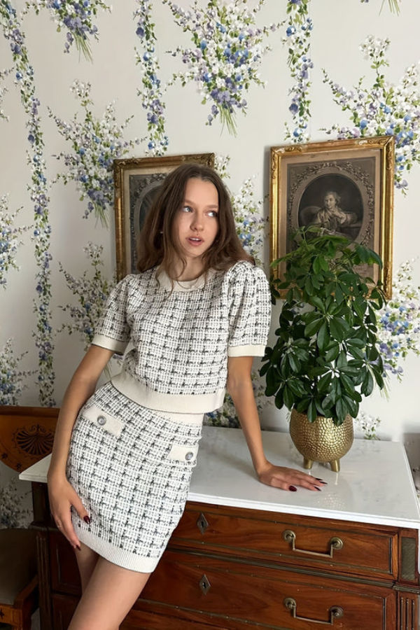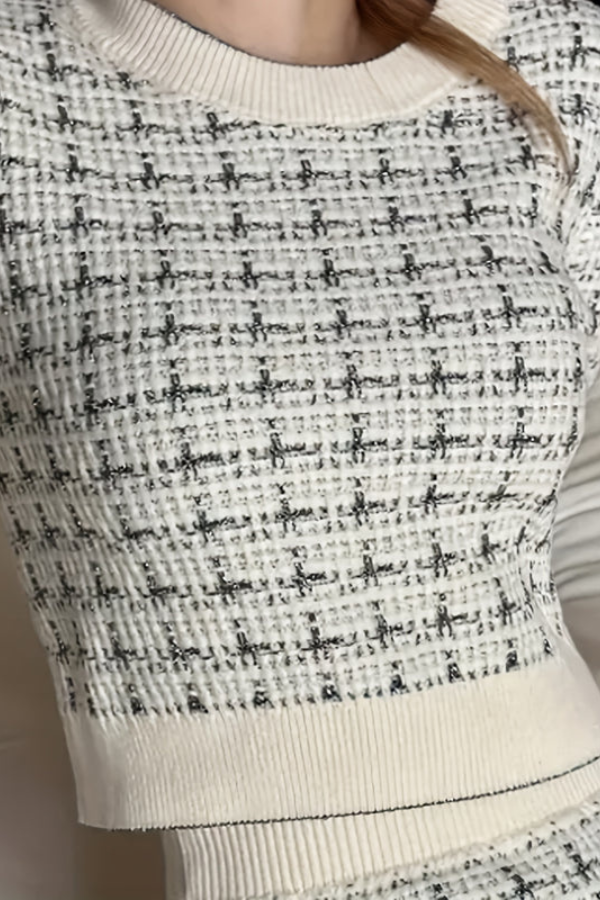 This women’s two-piece set features a short-sleeve round neck top paired with a matching checkered skirt, creating a polished yet modern look ideal for both daily wear and special gatherings.